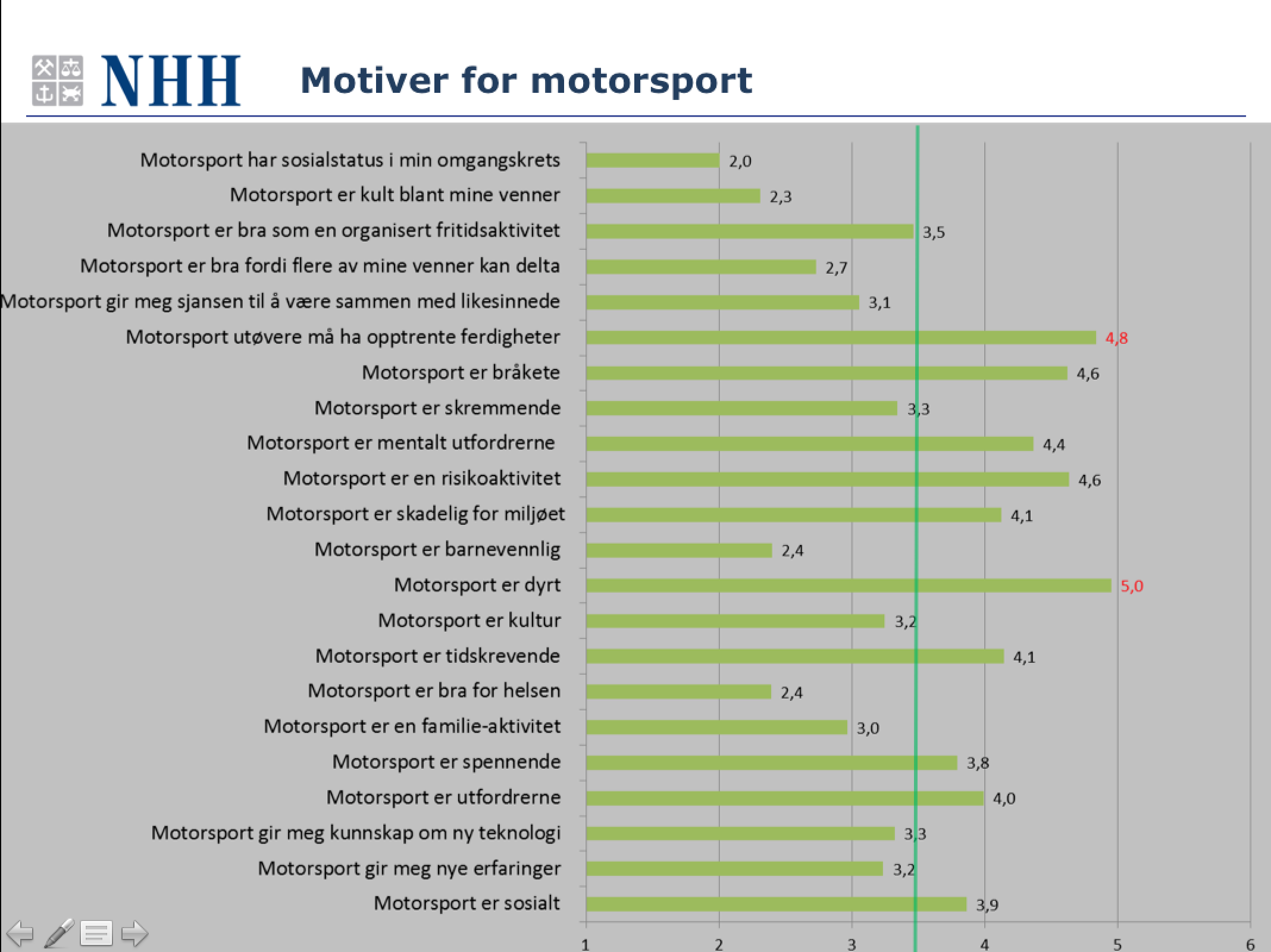 I den forbindelsen ble det også gjennomført en spørreundersøkelse med 586 respondenter fordelt mellom byene Oslo, Bergen, Stavanger og Haugesund. De ble spurt om holdninger til motorsport generelt. Resultatene viser både holdninger og fordommer og gir indikasjon på hva vårt forbund og klubber må arbeide med vedrørende annerkjennelse for våre idretter. Det virkelig positive er at våre idrettsutøvere blir anerkjent for gode ferdigheter (nest høystest score 4,9). Utover det har vi mye å arbeide med. Lav sosial status i vennekretsen, lite barnevennlig idrett, mindre bra for helsen, og kostnadskrevende idrett. Undersøkelsen viser også at folk som har kunnskap om motorsport har mer positive holdninger på forbedringsområdene. Særlig vedr. sosial status og barneidrett. Altså, vi har et viktig holdningsarbeid foran oss.